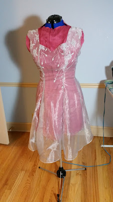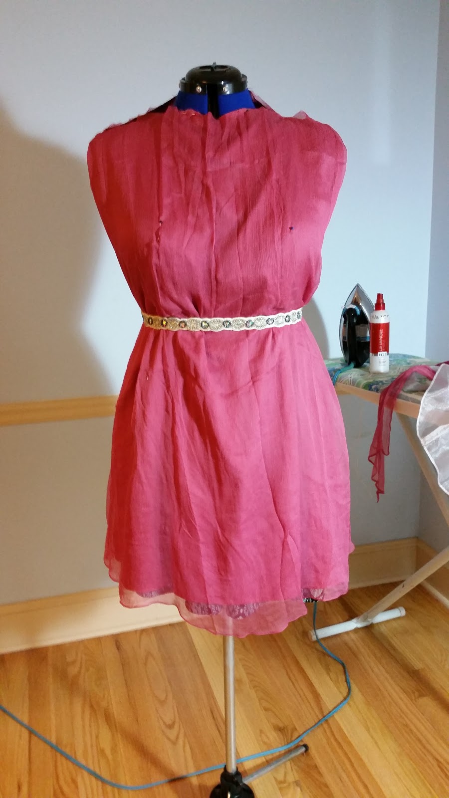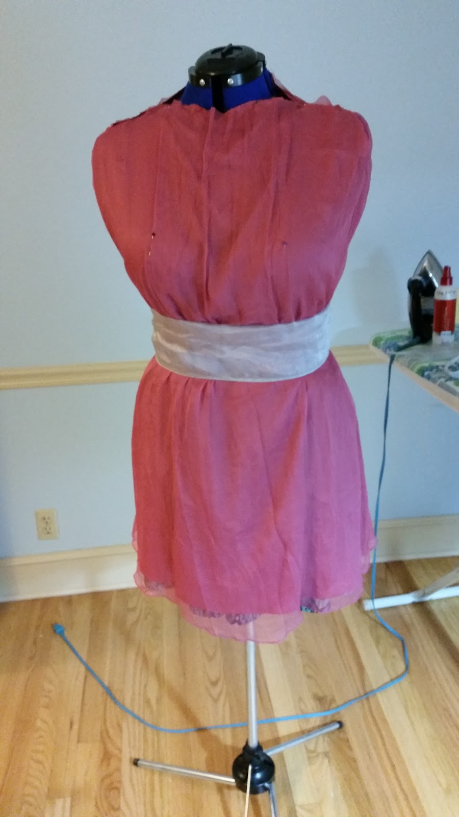 Then, I cut the bottom of the pink and pinned to the height I wanted the dress to be.