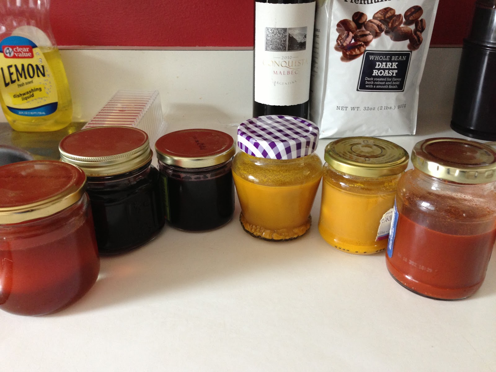 So in the picture from left to right: Onion skin, red wine, blueberry juice, 2 x turmeric and paprika powder. I hope they turn out. We will see tomorrow.