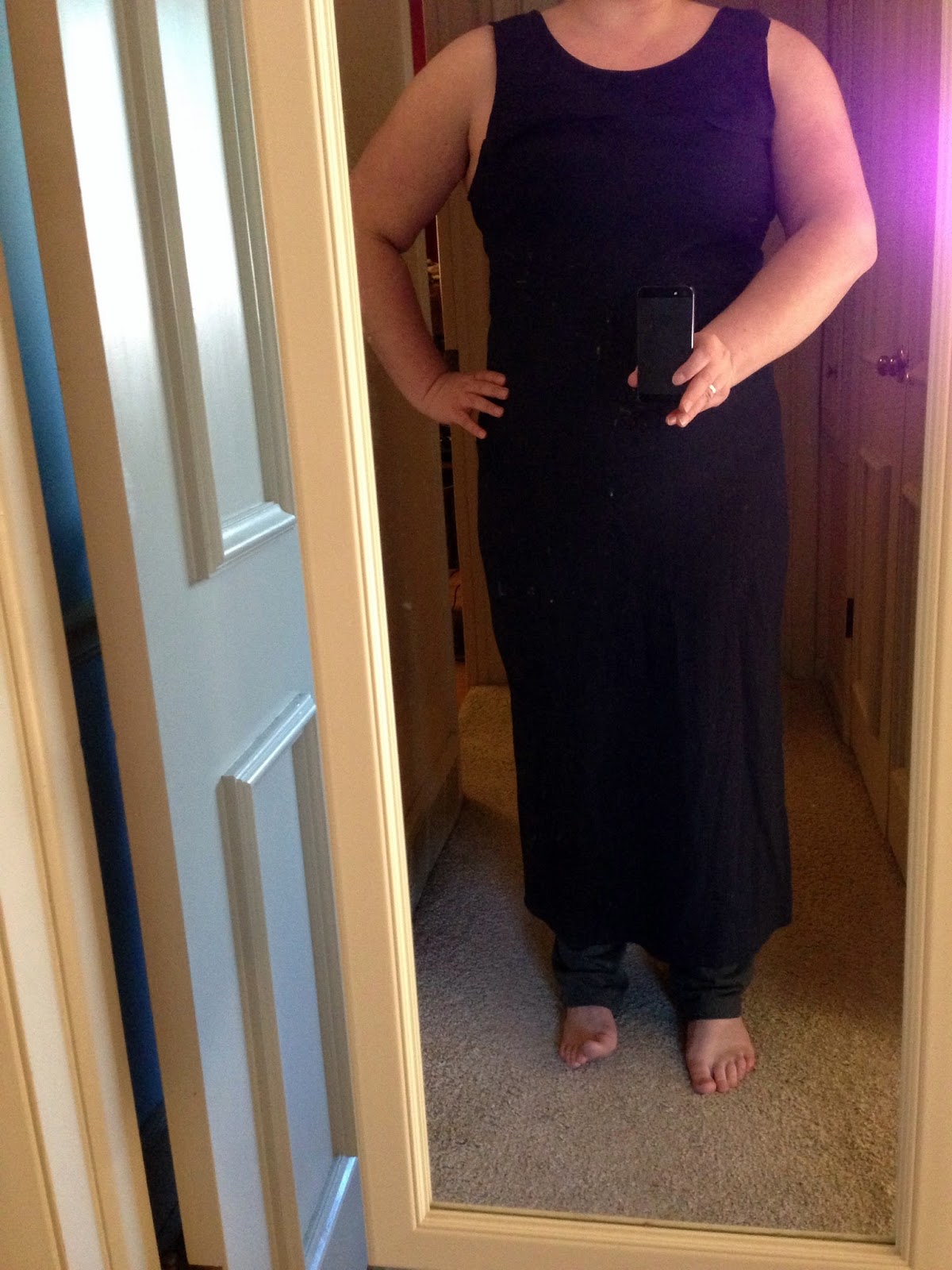 Last week I finished a nautical dress to wear to a wedding I attended on Saturday. I used a simple sheath maxi-dress that I bought at a thrift store for a few bucks. As you can see below it is a rather boring and unflattering dress (blah!)